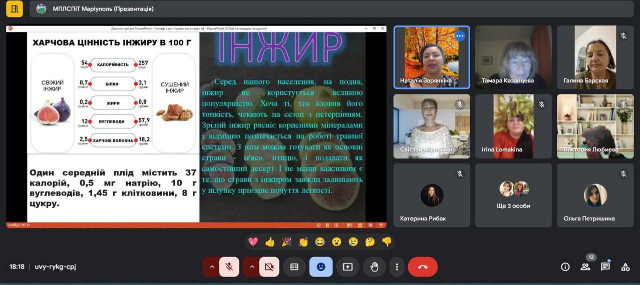 Захід розпочала викладачка спеціальних дисциплін Любієва Вікторія Миколаївна, яка представила відеопрезентацію "Конверти з шарового тіста з овочевою начинкою". Відеороботу "Осінні зірки з баклажанів" продемонструвала викладачка спеціальних дисциплін Ломакіна Ірина Іванівна. Майстриня виробничого навчання Фодлаш Світлана Володимирівна нагадала нам про чудовий осінній овоч в презентації "На столі не пусто, коли є капуста". А відеоробота "Королева осені — Капуста", яку підготувала викладачка спеціальних дисциплін Ковтун Оксана Олександрівна, розкрила всі переваги капусти в новому світлі. Та на завершення, рецептом смачного та корисного десерту «Інжир з ванільним морозивом, тар-таром із полуниці та бальзамічним соусом» поділилася майстриня виробничого навчання Зарянкіна Наталія Миколаївна.